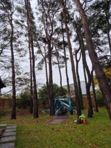 We carefully positioned our MEWP in a tight spot to safely remove a defective pine tree at Southgate, Gower.